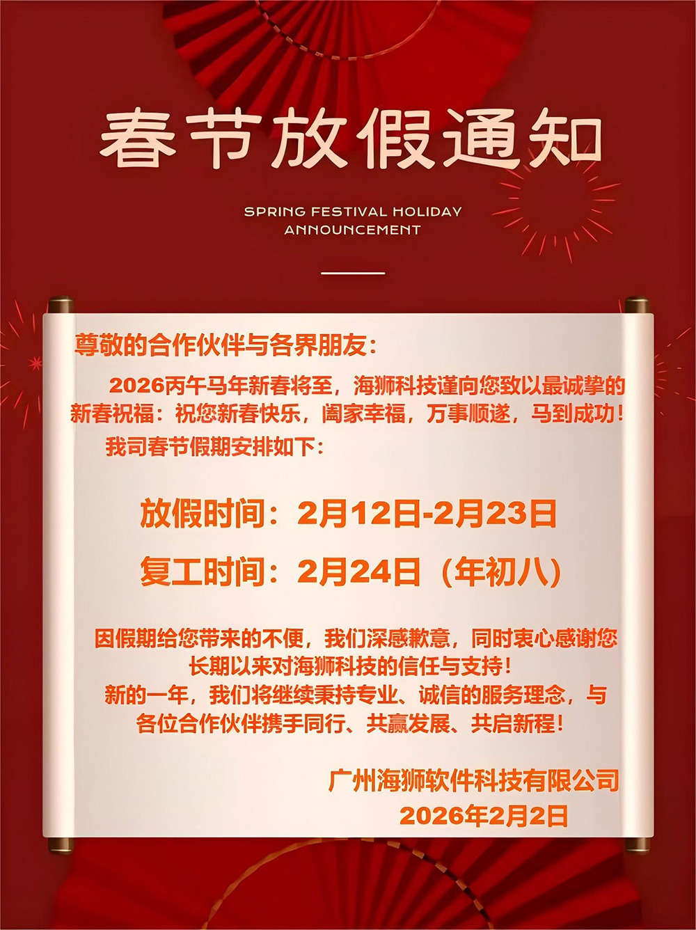2026丙午马年新春将至,海狮科技谨向您致以最诚挚的新春祝福:祝您新春快乐,阖家幸福,万事顺遂,马到成功!